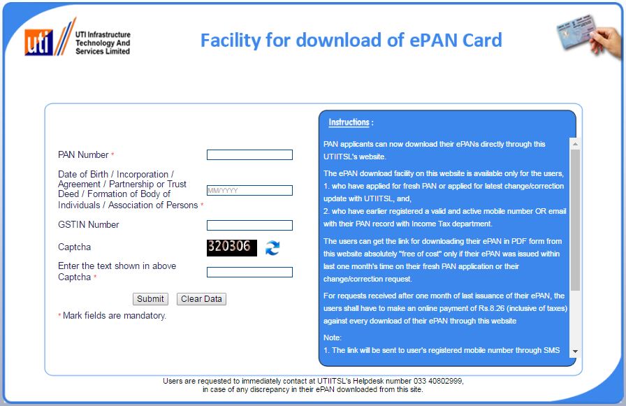 मेरा E-PAN डाउनलोड नहीं हो रहा है UTIITS के लिंक से